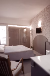 La luce del giorno entra morbida, accarezzando la muratura originale e rivelando la sua texture antica. Il letto matrimoniale, con materasso e guanciali in memory foam, sostiene il riposo più profondo. La doccia, chiusa da un cristallo trasparente, regala un momento di benessere lento, come una pioggia che scivola piano sulla pelle.